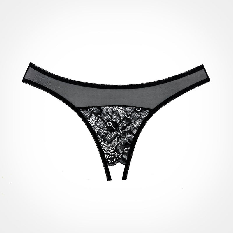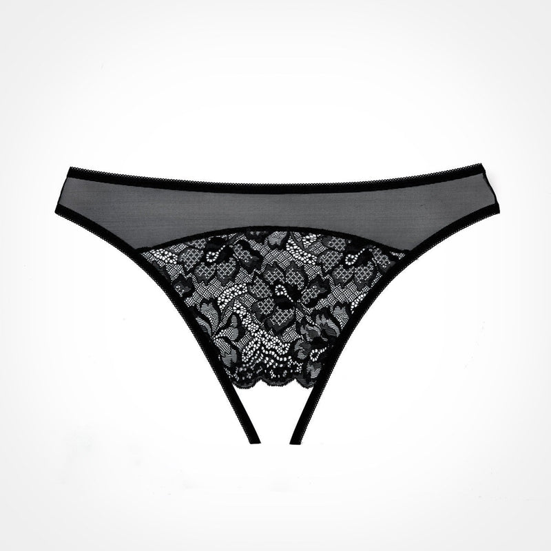 Fantasy follows where rumors go in this sinfully erotic crotchless panty, with a sneaky ouverte back. Delicate lace kisses both the front and back, and is topped all around by a band of sheer mesh.