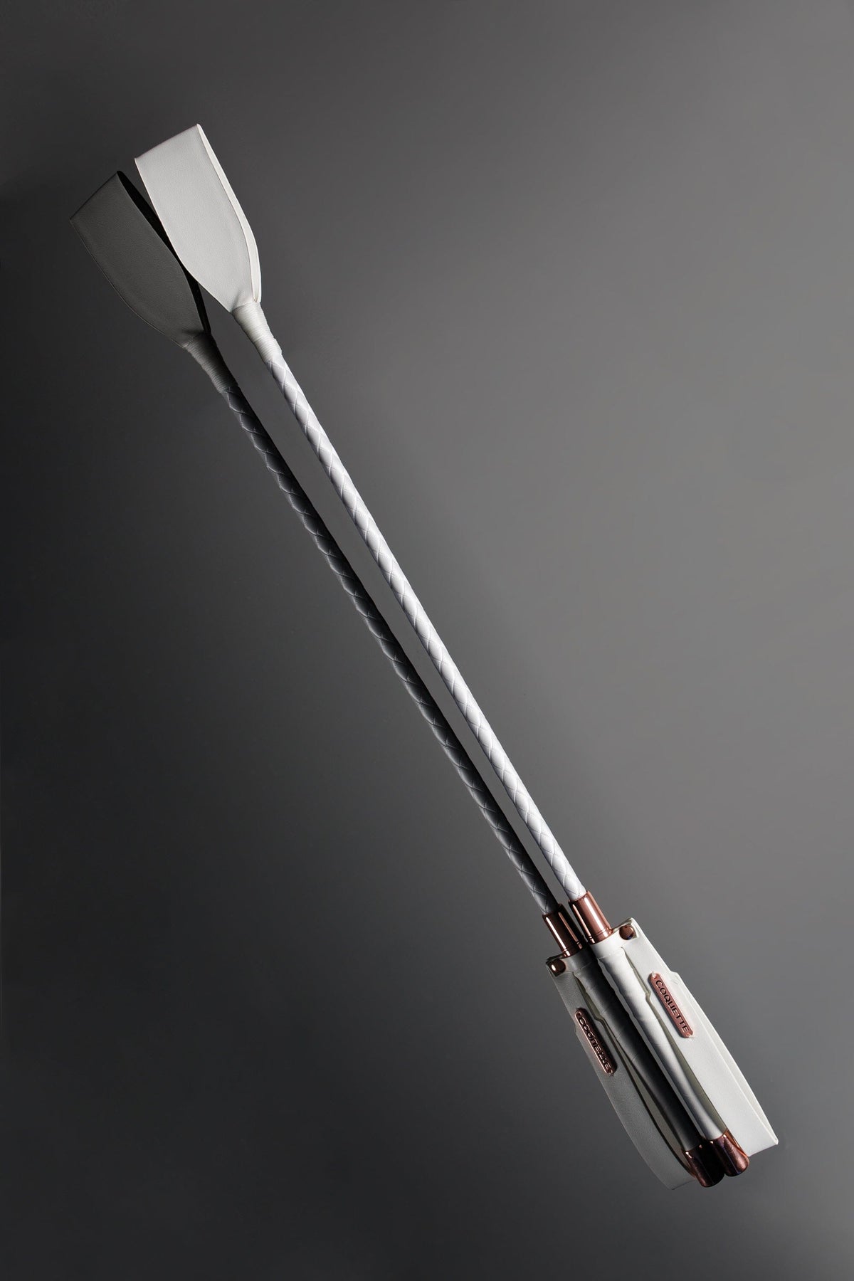 Crop features a matte finish diamond printed handle, a circumference of 11” (27.5cm), an overall length of 23.5” (59cm), a 3.75” (9.4cm) tip length, and a 1.5” (3.8cm) tip width. It is available in White/Rose Gold, and constructed of vegan leather and metal.