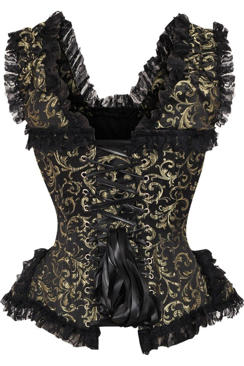 Top Drawer Gold/Black Swirl Brocade & Lace Steel Boned Corset w/Cap Sleeves