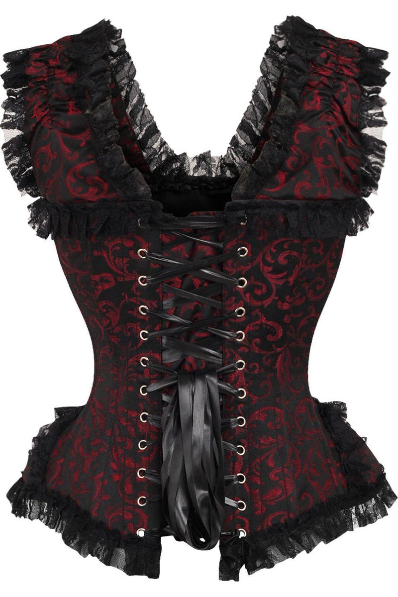 Top Drawer Red/Black Swirl Brocade & Lace Steel Boned Corset w/Cap Sleeves