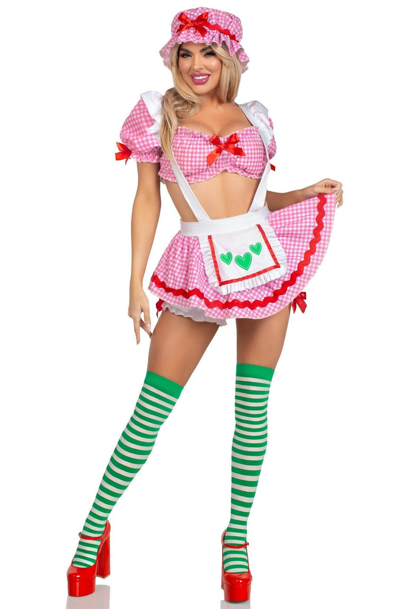 3 PC Berry Babe Gingham Set, includes gingham crop top, suspender skirt with attached bloomers, and bonnet.