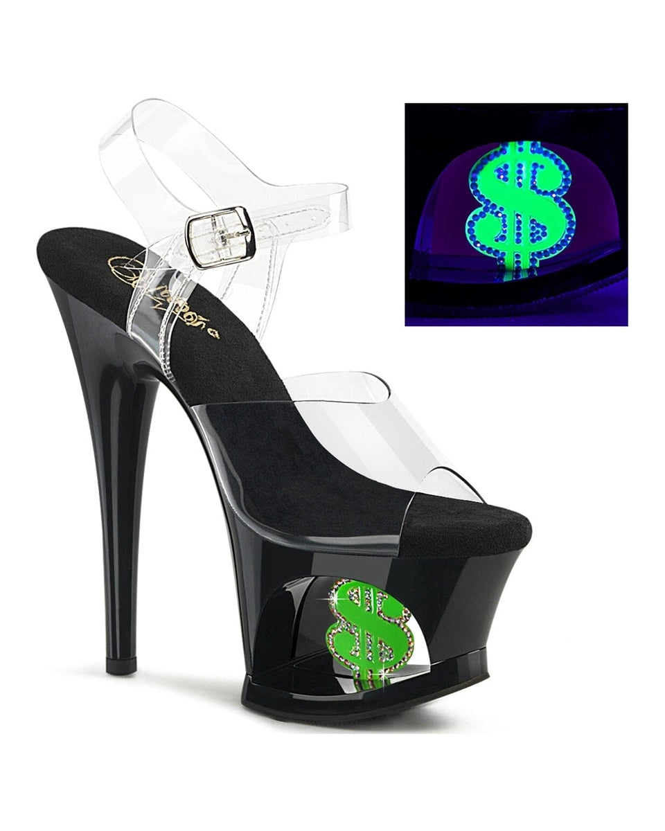 7" Heel, 2 3/4" Cut-Out Platform Ankle Strap Sandal w/Money Sign