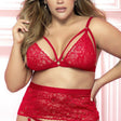 Lace teddy with ruffled details and laser cut heart on lower back; adjustable straps and garter belt, adjustable hook-and-eye crotch closure
