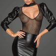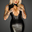 Alluring Powerwetlook body with open back and 2-way zipper in the crotch. Collar fastened with double clasp. Remarkable cleavage finished with lace.