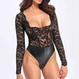 Delight in seduction with this captivating bodysuit, with a deep V-neckline in both the front and back. Complete with an erotic velvet garter, velvet choker, crotch zipper, and an exquisite silver and black pearl chain highlighting the front.