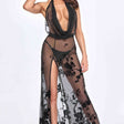 This sheer wildflower flock halter dress features a lavish rhinestone chain up the fully open back and slinky Powerwetlook collar. Just the outfit for when you want to show off your bodacious physique.