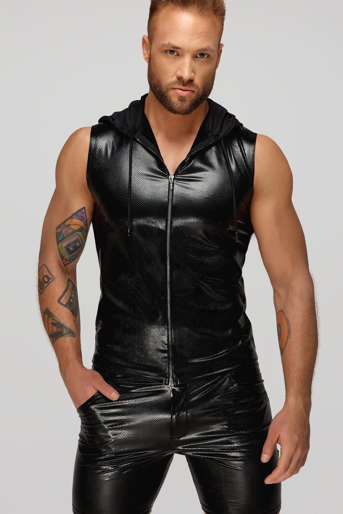 Every man is a hunk in this super sexy sleeveless top. Made of trendy snake wetlook with a sheer hood.
