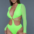 Who wants to rock this super sexy swimsuit? This one-piece long-sleeved swimsuit comes with mesh sleeves, front metal O-ring, thin string detailing around the torso and full coverage bottoms. This piece will send heads spinning!