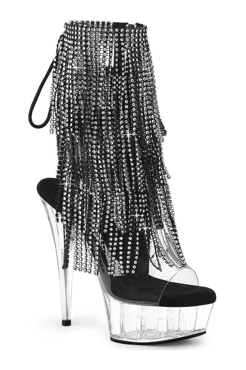 6" Heel, 1 3/4" Platform Open Toe/Heel Lace-Up Fringe Ankle Boot