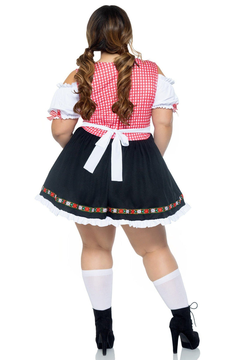 Beer Garden Babe, features gingham peasant dress with lace up detail and cold