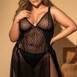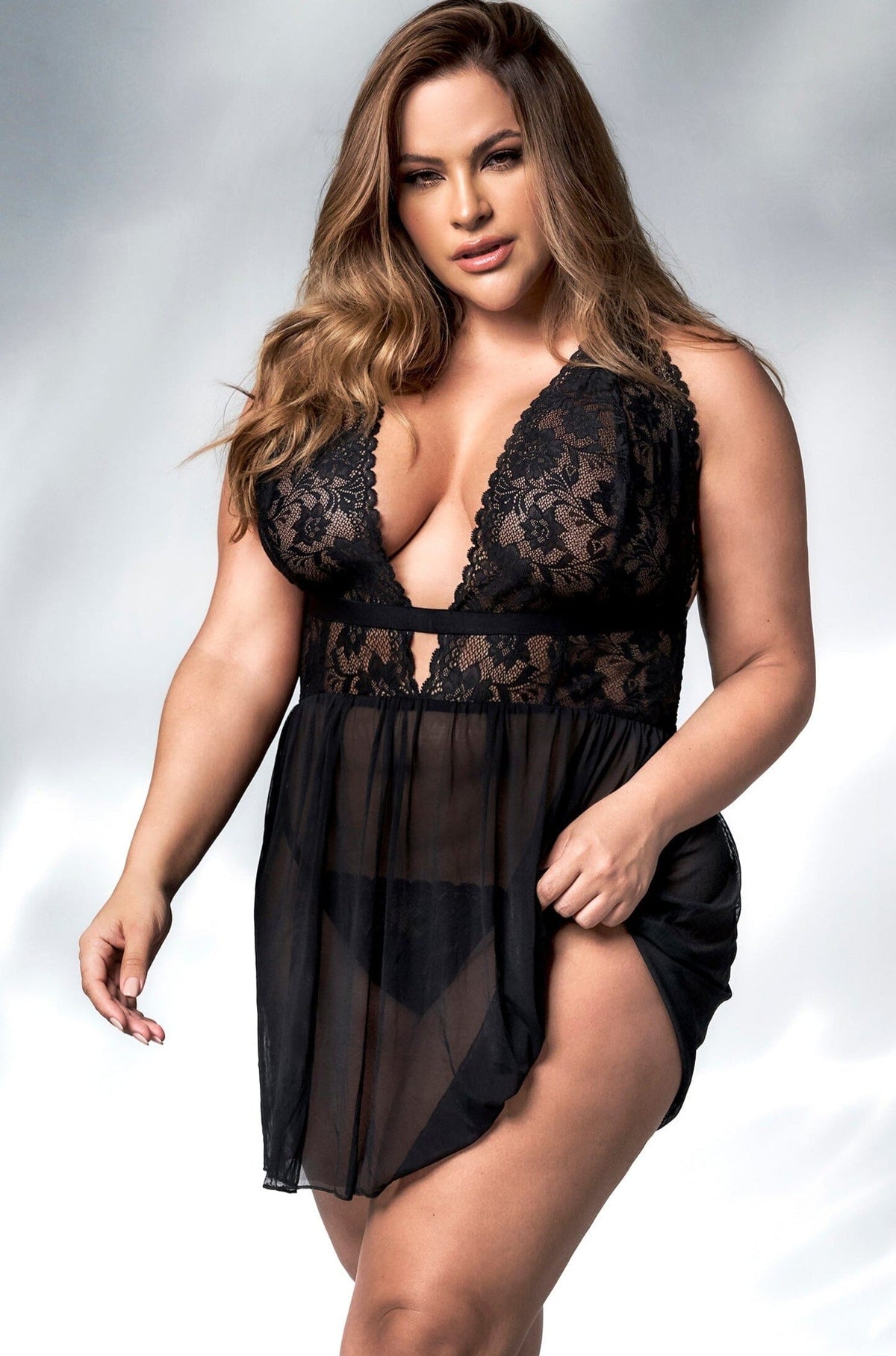 This timeless babydoll is an essential garment in your personal lingerie collection. With a deep lace neckline, transparent mesh skirt, adjustable straps and matching thong. Loose silhouette.