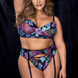 An essential two-piece set with a vibrant flower print on a sheer mesh with contrasting lace trims. Top with underwire support, adjustable straps and matching panty. Medium coverage.