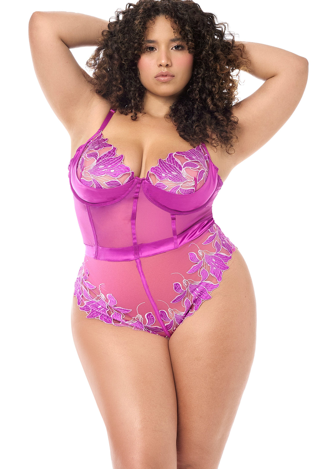 A sensual one-piece crafted in sheer mesh with delicate floral embroidery. Designed with adjustable straps and underwire cups for added support, it features a flattering open back with hook & eye closure, and a snap crotch for ease and comfort.