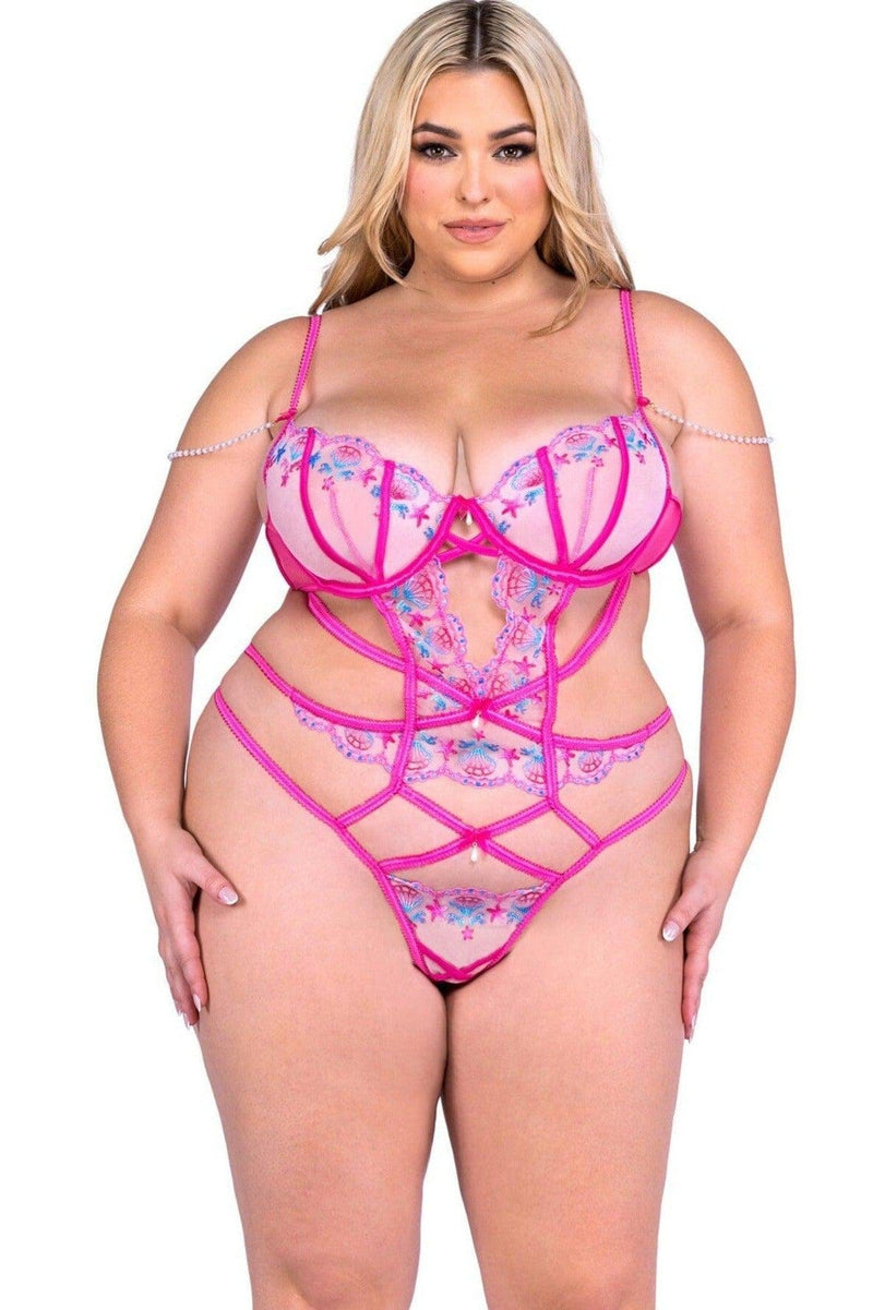 Simply stunning! This plus size colorful and strappy teddy features multicolor embroidered seashells with scallop lace, adjustable straps and stretch satin. With demi cups and underwire for the bust, this set also features organza ribbon bows, pearl strands and tear drop details.