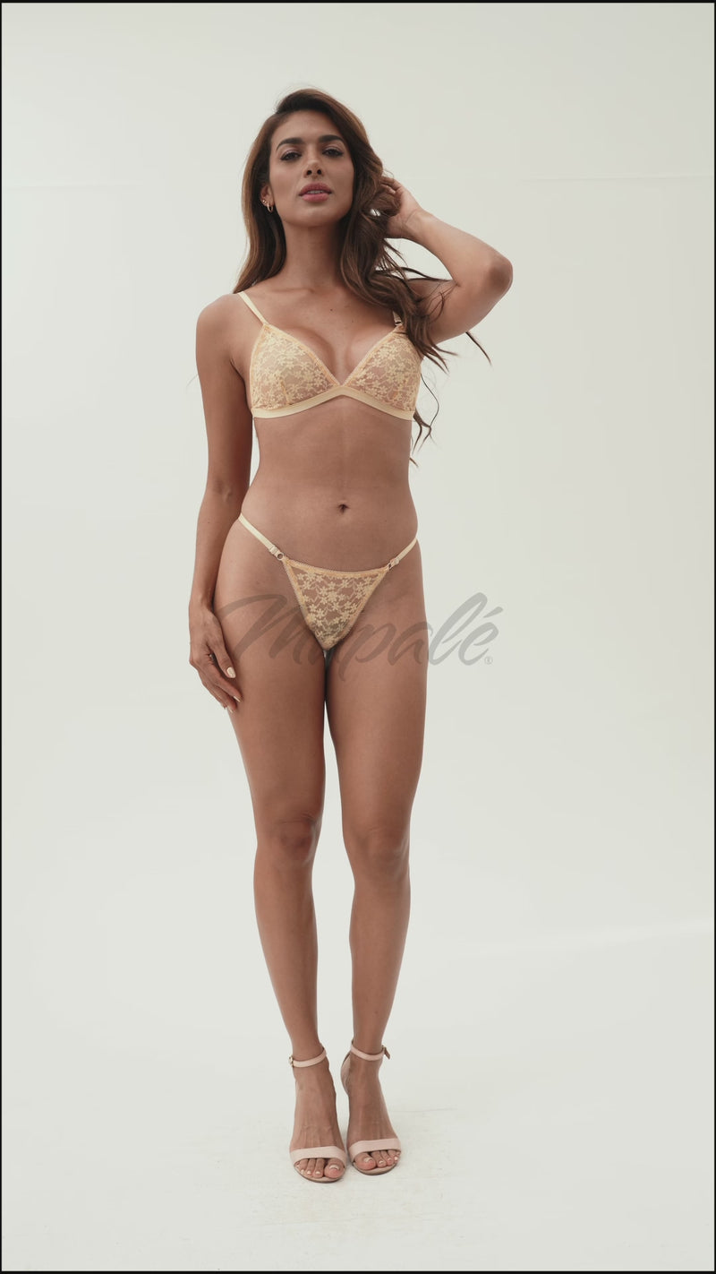 A must-have addition to your collection, this timeless two-piece set is crafted from romantic floral lace. It includes a triangle top with adjustable straps and a thong bottom for a flattering, delicate look.