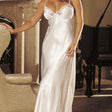 Charmeuse And Lace Long Gown with lace trimmed cups, low back with criss cross tie shoulder straps that tie down to a flowing train of scalloped lace and charmeuse. Colors: Black, Electric Blue, Red, White. Sizes: S-M-L-XL.