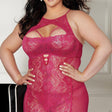 Textronic Stretch Lace Gartered Chemise with high lace neck and strappy detailing along bust and offers hidded under wired cups, open back with hook back closure, adjustable straps and garters. Comes with a G-String. Colors: Black, Rasberry. Sizes: 1X-2X-3X. Shown with X90024 Stockings