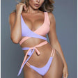 2 pc bikini set with halter string triangle tie closure top and string bikini bottoms. Machine wash delicate. Do not bleach. Do not Iron. Do not tumble dry. Do not dry clean. Poly bag packaging.