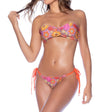 A trendy and playful two-piece swimsuit inspired by the summer. It features a micro triangle top with crochet floral details and a side-tie thong bottom in a contrasting, realistic crochet print.
