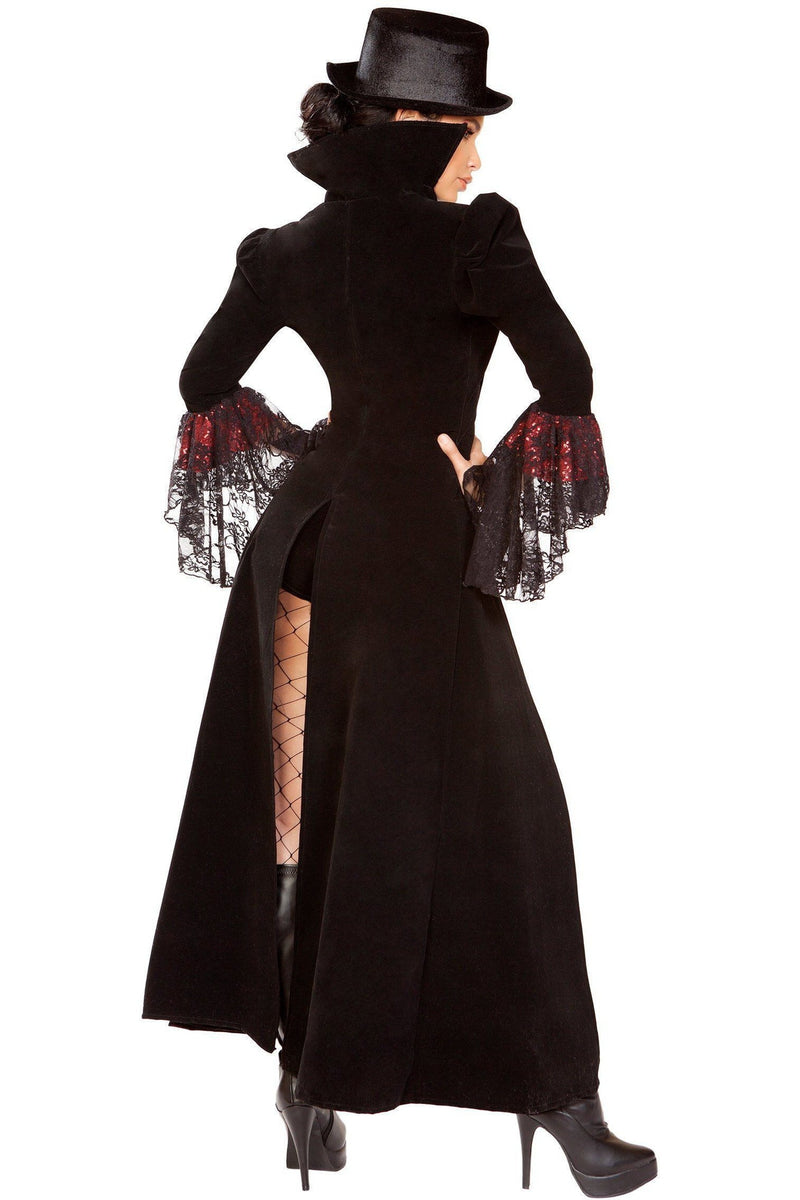 Includes Long Coat with Flair Sleeves and Trim Detail on Collar and Built in Corset with Zipper Closure, Neckpiece, Shorts, & Top Hat