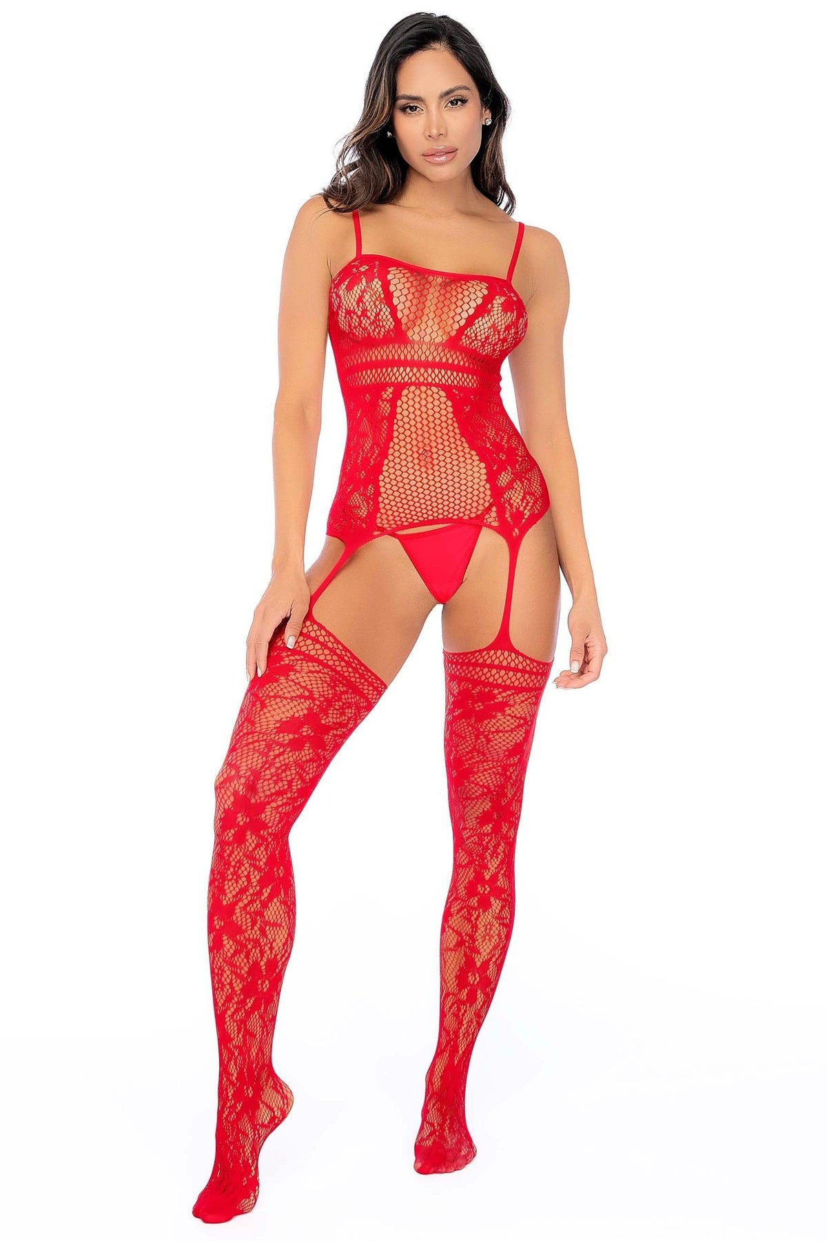 Turn up the allure in this side-floral fishnet bodystocking, designed with sheer, body-hugging fishnet that teases from every angle. Intricate floral panels trace down the sides, creating a curve-enhancing effect that blends feminine detail with bold seduction.