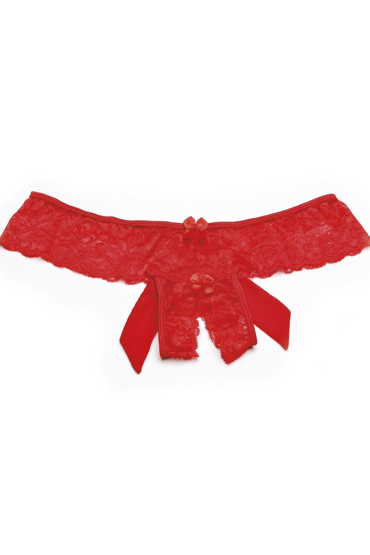 Stretch Lace Open Front Panty with back bow. Colors: Black, Rose, Red. Sizes: S-M-L-XL.