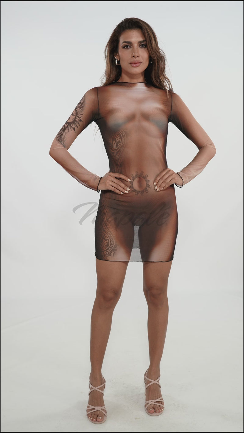 This long-sleeved mesh dress features an illusion print that highlights the body's natural shape, complemented by tattoo-inspired art for a bold, artistic look.