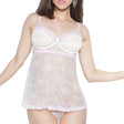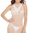 Sheer snap crotch bodysuit with eyelash lace panel and back keyhole with button closure.