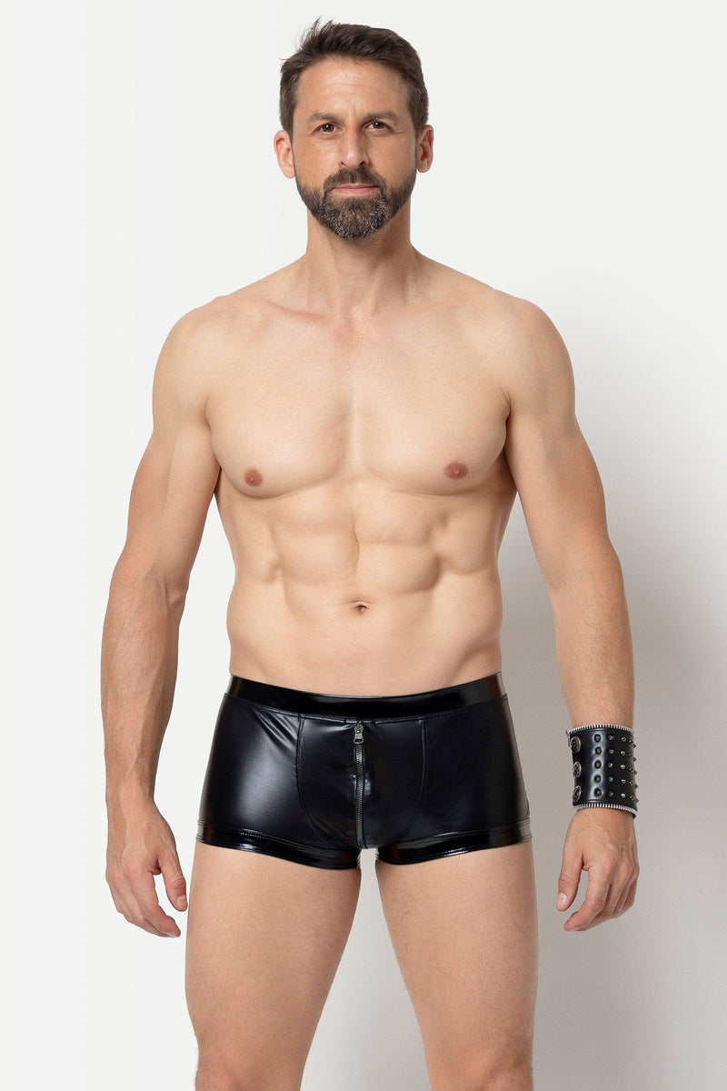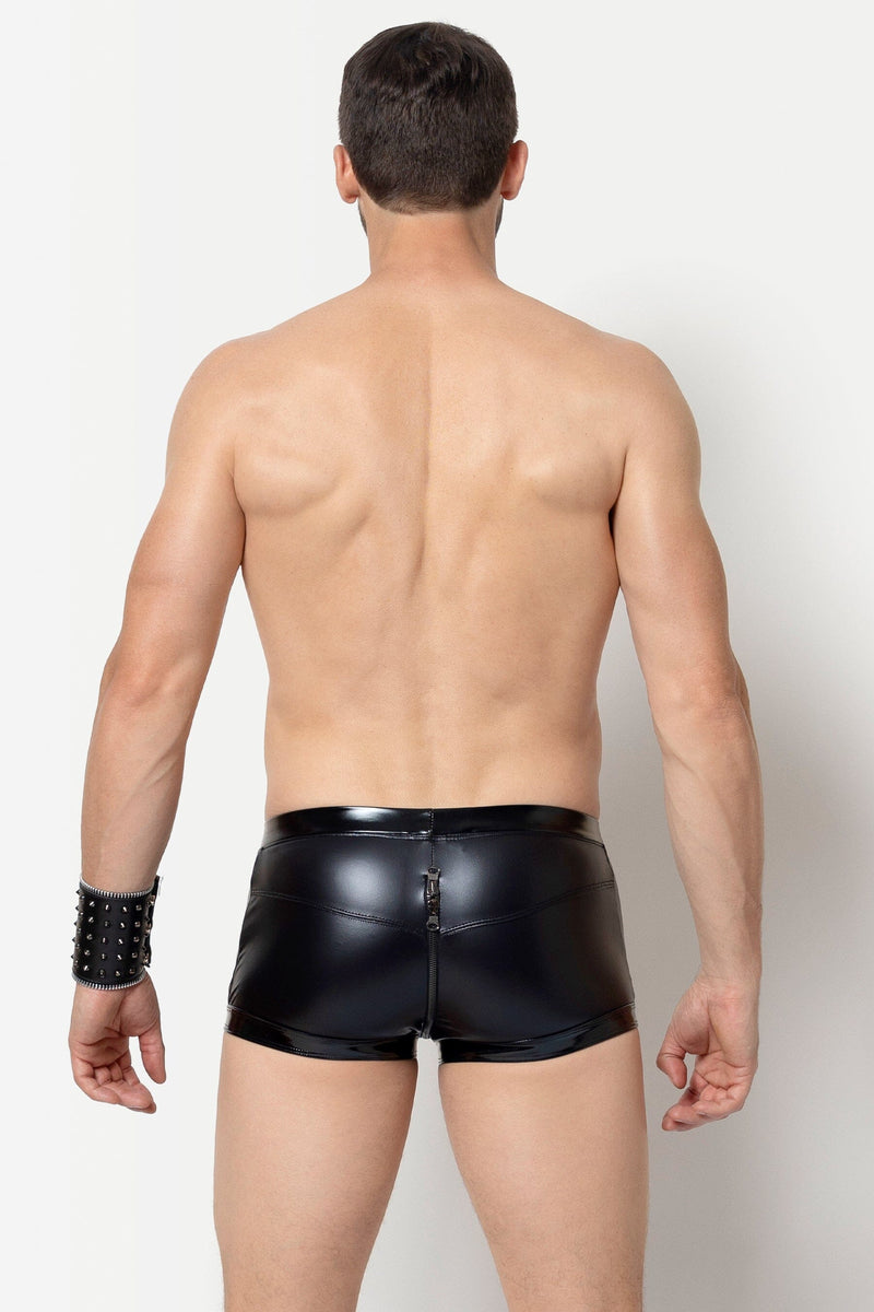 Experience the bold masculinity of Rayan Trunks! These black wetlook trunks feature shiny vinyl details on the waistband and thighs, and a stretchy, comfortable fabric. Open up new possibilities with the full zip and dual sliders.