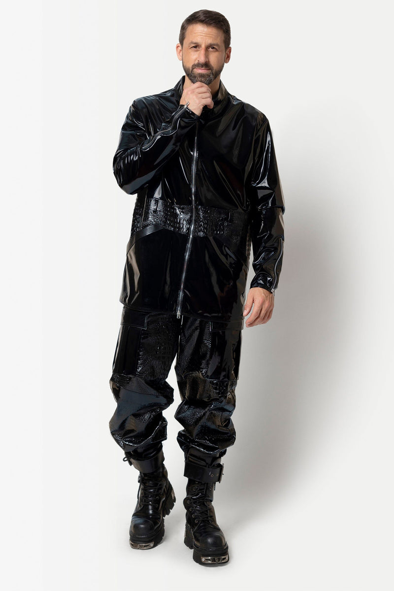 Here is a new model for you gentlemen. An overshirt that you can wear over a sweater, t-shirt or shirt for a super trendy look. Holger is made of glossy black vinyl and has structured black vinyl panels, crocodile-style, for a contrasting effect on the waistline, the two pockets located on the back as well as inside the front pockets. A strip of faux leather is present on the four pockets of this original model. The loops allow you to slip a belt inside. A zipper is present along the entire length and you can also open the zippers on the bottom of the sleeves.
