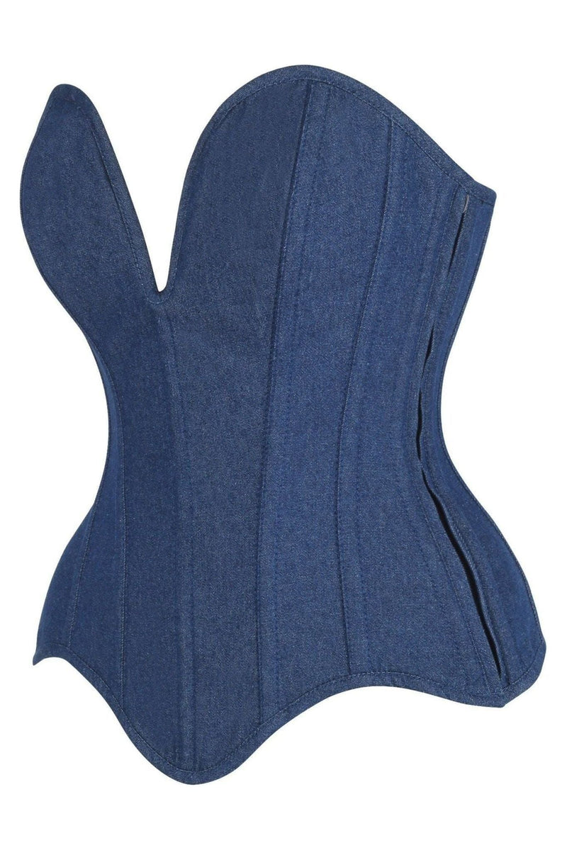 Top Drawer Steel Boned Dark Blue Denim Plunge Neckline Overbust Corset